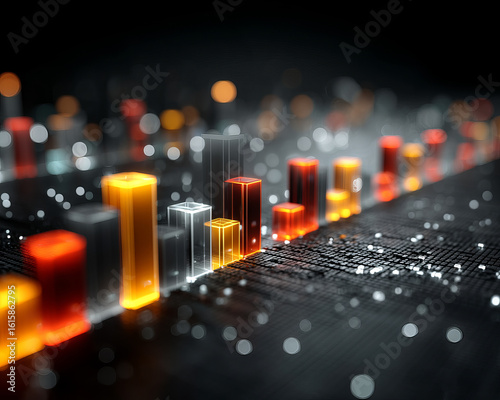 bar, chart, glowing, datum, technology, digital, futuristic, light, abstract, business, finance, graph, illuminated, orange, yellow, black, background