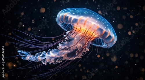 Glowing blue jellyfish gracefully moves through dark waters at night