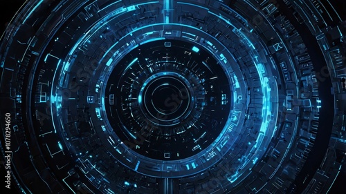 Glowing Blue Neon HUD Display with Intricate Geometric Patterns, Cyberpunk Aesthetic, and Alien Technology against a Dark Starry Background V6