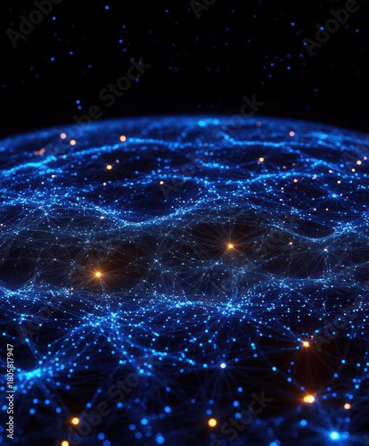 glowing blue network mesh of interconnected nodes and filaments with orange focal lights on a curved digital landscape under a dark starry sky, evoking futuristic wonder