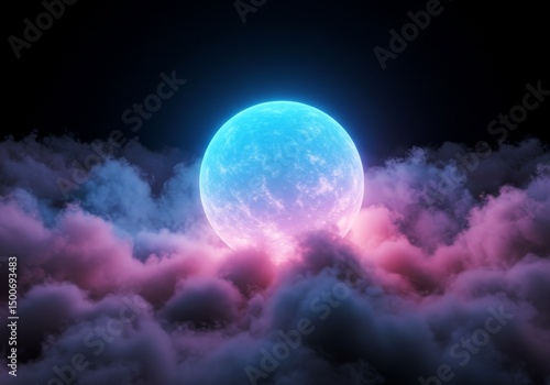 Glowing Blue Sphere Above Pink Clouds in Dark Night Abstract Illustration