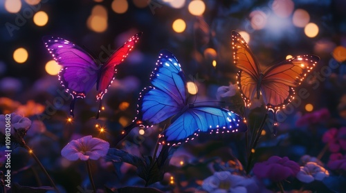 Glowing butterflies in garden at night.