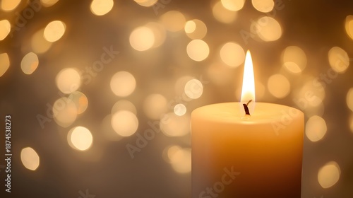 Glowing Christmas candles with burning wax flames shine against a dark black background of golden holiday lights for a romantic advent celebration