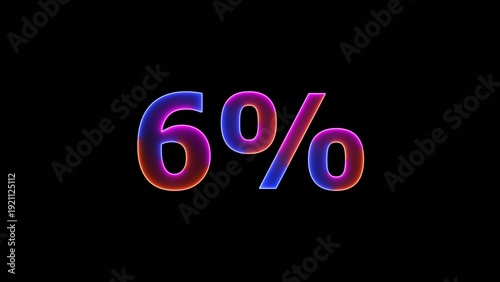 Glowing colorful Neon number 6% on black background. 6 Percent Off Sale. 4k illustration.