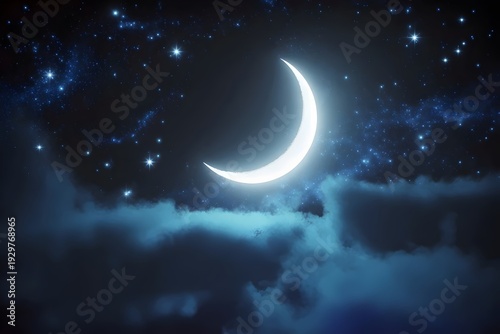 Glowing crescent moon shines brightly in a dark, cloudy night sky filled with twinkling stars and ethereal light.