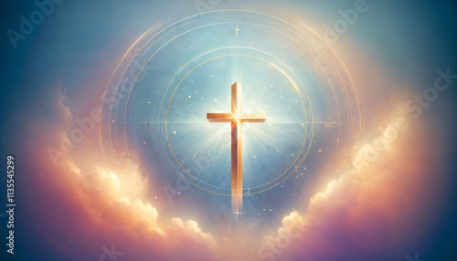 Glowing cross surrounded by heavenly light and clouds, symbolizing faith, spirituality, and divine hope for a website banner