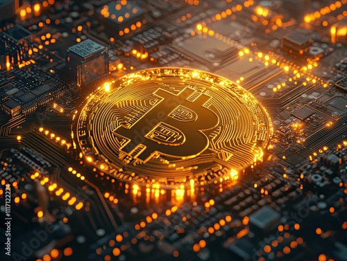 digital, coin, circuit, board, technology, gold, metallic, glow, light, illuminated, electronic, network, finance, money, currency, transaction, mining, computing, processing, datum, innovation, future, abstract, pattern, design, background, texture, system
