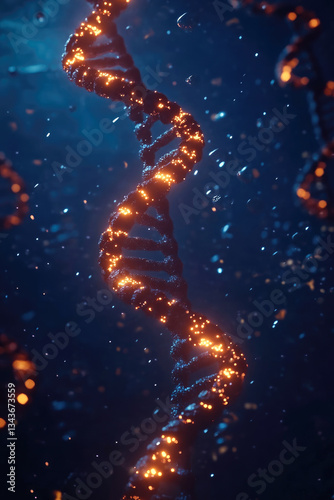 Glowing dna helix structure in blue ambient light with sparkling particles