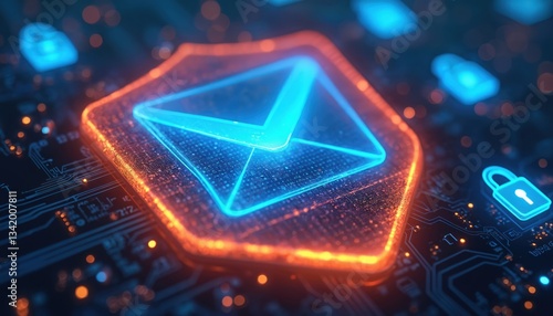 Glowing email icon with shield, digital locks in background, illustrates robust email security measures. Concept privacy protocol protection, communication system, safeguard, enhancement, digital