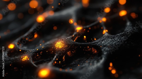 dark, black, volcanic, surface, ember, glowing, orange, fire, heat, texture, abstract, background, design, art, digital, illustration, light, spark, particle, energy, intense, hot, molten, lava, rock, rough, detail, macro, close, up, depth, field, contrast, shadow, bright, gleam, shine, fiery, cosmic, nebula, mystical, enigmatic