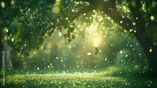 light bulb, glowing, tree, branch, green, nature, background, environment, eco, energy, idea, innovation, inspiration, imagination, creative, bright, light, spark, shine, magic, fairy, firefly, summer, spring, forest, wood, leaf, grass, ground, green background, environmental, sustainable, renewable energy, concept, bright light