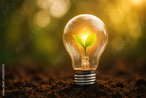 Glowing light bulb planted in soil with sprouting green leaves symbolizing sustainable energy innovation and environmental conservation