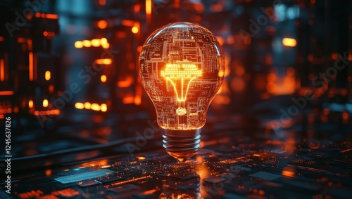 Glowing Light Bulb with Futuristic Circuitry in a Digital Environment, Illuminating Innovation and Technology Concepts, 3D Rendered Vivid Art