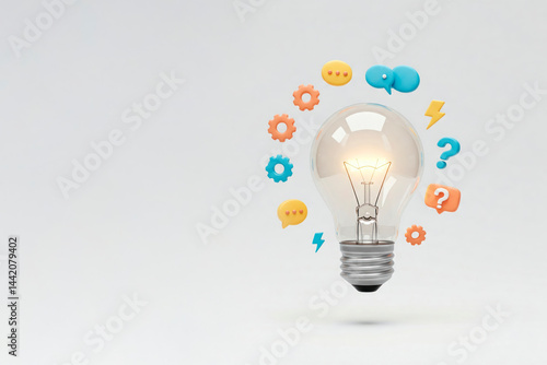 Glowing light bulb with idea icons on a clean background. Space for text.