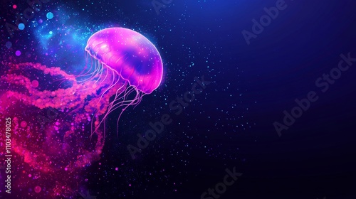 Glowing Neon Jellyfish with Colorful Tentacles Against Dark Deep Sea Background, Cosmic Style Art