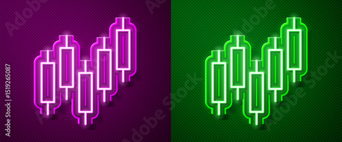 Glowing neon line Browser with stocks market growth graphs and money icon isolated on purple and green background. Monitor with stock charts arrow on screen. Vector