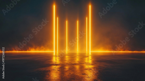 pillar, glowing, orange, high technology, abstract, background, light rays, yellow, darkness, water surface, science fiction, future, rendering, digital, minimalist, symmetric, vertical, energy, neon, wallpaper, lighting, stripes, line, mysterious, atmosphere