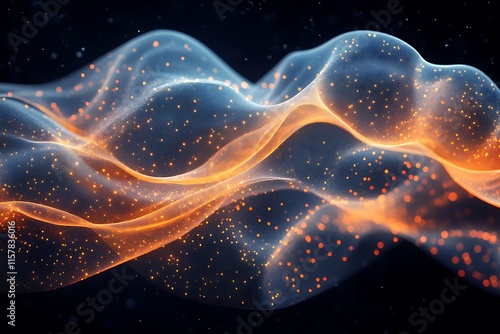 wave, pattern, abstract, particle, glowing, light, dark, orange, blue, texture, design, background, digital, art, illustration, graphic, modern, energy, vibrant, shimmer, sparkle, glistering, cosmic, nebula, space, flow, motion, dynamic, elegant, futuristic, technology, science, fantasy, mystical, aethereal, beautiful, stunning, intricate, detailed, gradient, mesh