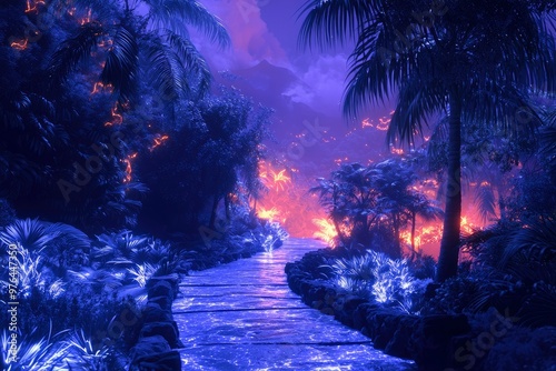 Glowing Path Through a Blue and Orange Tropical Forest