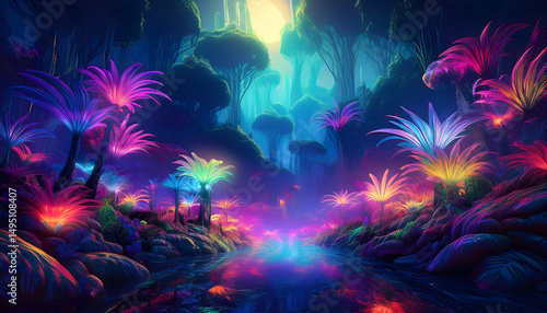 fantasy, forest, river, glowing, night, magical, landscape, nature, light, colourful, vibrant, surreal, alien, dreamlike, beautiful, scenic, tranquil, peaceful, mysterious, enchanting, aethereal, wallpaper, background