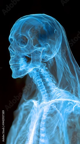 skull, skeleton, head, neck, spine, bone, anatomy, x-ray, medicals, health care, human, body, profile, blue, glow, light, transparent, aethereal, ghostly, mystical, mysterious, art, image, graphic, illustration, design, digital, rendering, three-dimensional, model, science, biology, medicine, health, structure, vertebrate, cervical, clavicle, torso, skeletal, bod, bone structure