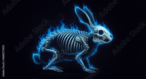 rabbit, skeleton, anatomy, glowing, creature, bone structure, dark background, fantasy, bioluminescence, x-ray, mammal, eerie, mystical, artwork, imagination, unreal, science fiction, digital illustration, poster, realistic, spectral, aethereal, animal, isolated, illustration, nature, rabbit, art, light, energy, glow, colours, blue, black, background, smoke, design, fractal