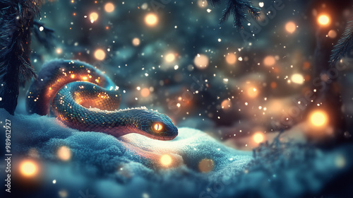 Glowing snake resting in a snowy forest with magical lights
