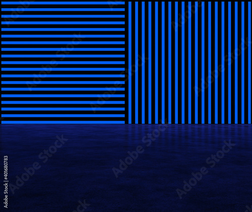 Glowing vertical and horizontal stripes in blue. Abstract glowing background of stripes. Glowing wall of blue. 3D visualization