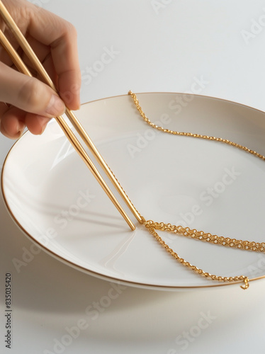 gold chains meal in plate. A woman using chopsticks to pick up the gold chains meal to eat.Minimal creative food concept.Flat lay