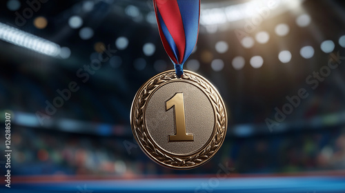 Gold medal with number one hanging on a ribbon in a stadium – symbol of victory, achievement and success