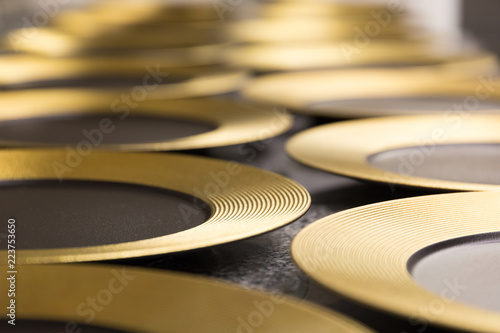 Gold rimmed round plates laid out on a restaurant table preparing to be used for dinner.