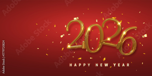 new, year, 2026, gold, celebration, holiday, christmas, festive, design, background, greeting, luxury, shiny, event, bright, confetti, colours, sparkle, element, decoration, elegant, number, happy, red, metallic, symbol, glamour, light, realistic, three-dimensional, art, modern, concept, render, poster, illustration, card, creative, template, graphic, joy, decor, party, success, hope, season, future, victory, vector