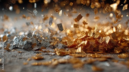 Golden and silver metallic foil particles flying in air with shallow depth of field ideal for celebration visuals, luxury design or abstract art