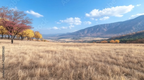 meadow, tree, foliage, autumn, land, nature, serene, peaceful, wilderness, tranquil, panoramic, vibrant, seasonal, horizon, picturesque, mountain, rural, scenic, blue, sky, cloud, orange, outdoors, beauty, fall, grass, field, landscape, environment, travel, summer, countryside, forest, view, gold, blue skies, hill