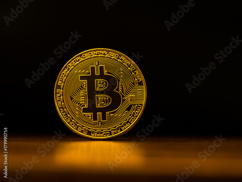 Golden bitcoin cryptocurrency banking money transfer business technology with black background. Concept of distributed ledger technology and digital electronic binary money financial.