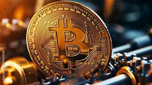 Golden Bitcoin Cryptocurrency Coin on Machine Gears