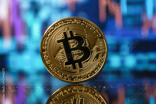 Golden bitcoin on reflective surface with colorful financial data background