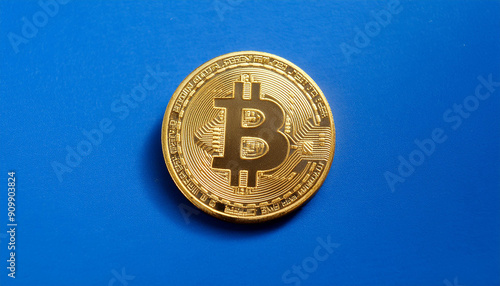 Golden bitcoin symbol on blue. Financial prosperity and wealth. Business and money, economic