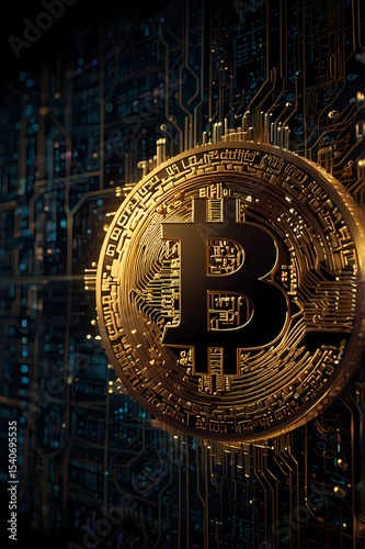 Golden Bitcoin Symbol on Futuristic Circuit Board Background