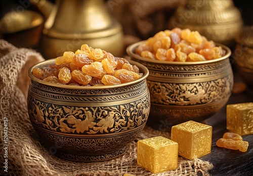 grape, gold, bowl, sweet, cube, dessert, dried, fruit, ornate, metal, gold, delicious, treat, luxury, texture, food, photo, still, life, background, dark, brown, burlap, antique, vintage, pattern, detail, rich, appetising, healthy, snack, epicure, elegant, exotic, aromatic, flavorful, natural, traditional, culture, close, up, image, picture