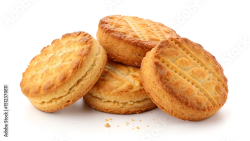 Golden brown butter biscuits with sweet taste, shown isolated on white background for advertising, branding, or web use.