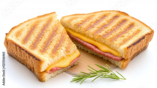 sandwich, cheese, ham, grilled, food, cookery, meal, lunch, dinner, breakfast, delicious, tasty, appetising, comfort food, classic, simple, easy, receipe, cooking, food photography, white background, closeup, macro, bread, epicure, culinary, eatery, cafes, snack, finger food, savoury, high-quality, photo, image, cut, half, rosemary, butter