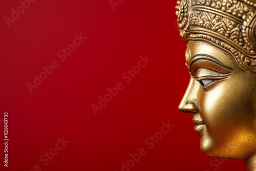 Golden buddha statue profile on red background: tranquil and majestic