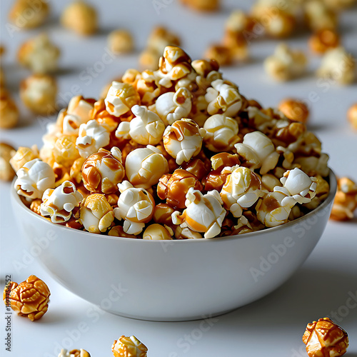 popcorn, caramel, snack, dessert, food, white bowl, sweet, treat, indulgence, epicure, delicious, tempting, closeup, food photography, crispy, buttery, light background, isolated, homemade, savoury, fresh, white background, tasty, snack food, crunchy, brown sugar, comfort food, bowl