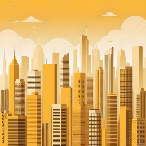 city, city landscape, skyline, urban, building, skyscraper, metropolis, architecture, city landscape, modern, yellow, gold, sunset, sunrise, golden hour, tower, highrise, city view, urban scene, downtown, business, commercial, development, construction, real estate, horizon, cloud, sun, light