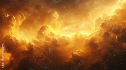 Golden clouds fill cosmic vista. Ethereal glow shines through warm cloud formations. Celestial beauty. Space view. Cosmic scene. Dynamic space art. Unique cloud design. Warm tones.