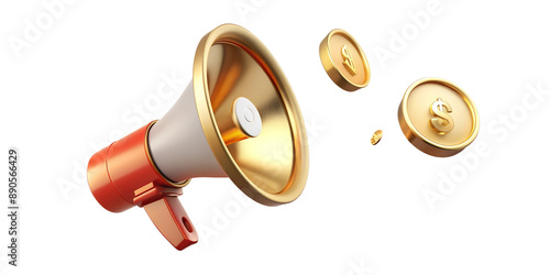 Golden coin flying and money cash out in the air out of red megaphone on white or tansparent background