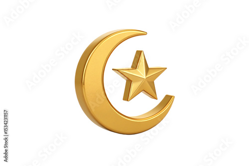 gold, crescent, moon, star, islamic, symbol, three-dimensional, metallic, shiny, lustrous, religious, muslim, decoration, ornament, trophy, award, ceremonial, spiritual, faith, worship, ramadan, eid, mosque, arabic, cultural, traditional, brass, bronze, luxury, premium, elegant, sophisticated, polished, gleaming, radiant, brilliant, sacred, holy, divine, celestial, astronomic, night time, evening, twilight, emblem