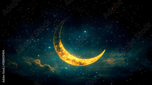 crescent, moon, night, sky, star, cloud, glow, gold, dark, celestial, astronomy, space, cosmic, heavenly, mystical, magical, dreamy, serene, tranquil, peaceful, romantic, beautiful, bright, shiny, sparkling, twinkling, lunar, cosmos, universe, galaxy, lactic, way, astral, light
