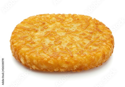 Golden crispy hash brown patty, shredded potato texture isolated on white background